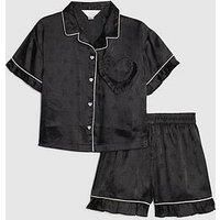 River Island Older Girls Satin Heart Pyjama Set Size & Fit Available in sizes 5-6 years - 13-14 years Details Older Girls Satin Heart Pyjama Set by River Island Black Revere collar Short sleeve Button front fastening Heart patch pocket Elasticated waist shorts Frill detail Heart print Contrasting piping detail Material & Care Material Content: Polyester: 100% Washing Instructions: Machine Washable