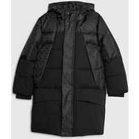 River Island Mini Boys Monogram Blocked Longline Puffer Coat Size & Fit True to size - order your usual size Regular fit Calf length Available in sizes 12-18 months - 4-5 years Details Boys Monogram Blocked Longline Puffer Coat by River Island Mini Black Hooded RI Monogram print Padded Long sleeves Material & Care Material Content: Cotton: 100% Washing Instructions: Machine Washable