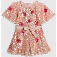 River Island Older Girls Sequin Flower Playsuit Size & Fit True to size - order your usual size Regular fit Available in sizes 5 years - 14 years Details Older Girls Sequin Flower Playsuit by River Island Pink Short flared sleeves Tie waist belt Round neck Back zip fastening Sequin texture Flower embellishment Material & Care Material Content: Cotton: 100% Washing Instructions: Machine Washable