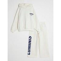 River Island Older Boys Luminis Back Print Hoodie Set Size & Fit Available in sizes 5-6 years - 13-14 years Details Older Boys Luminis Back Print Hoodie Set by River Island Cream Long sleeve Hoodie Front kangaroo pocket Graphic print Wide leg joggers Elasticated waistband Side slip pockets Material & Care Material Content: Cotton: 100% Washing Instructions: Machine Washable - Manufacturers part number: WRNJ7
