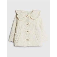 River Island Mini Girls Bow Quilted Collar Jacket Size & Fit True to size - order your usual size Regular fit Regular length Available in sizes 12-18 months - 4-5 years Details Girls Bow Quilted Collar Jacket by River Island Mini Cream Collared Stud pressed fastening Long sleeves Side slip pockets Stitched bow print Lightweight Material & Care Material Content: Polyester: 100% Washing Instructions: Machine Washable