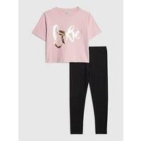 River Island Older Girls Love T-Shirt and Legging Set Size & Fit Available in sizes 5-6 years - 13-14 years Details Older Girls Love T-Shirt and Legging Set by River Island Pink 2-piece set Crew neck T-shirt Love graphic Short sleeves Lightweight Full-length leggings Elasticated waistband Material & Care Material Content: Cotton: 100% Washing Instructions: Machine Washable - Manufacturers part number: WTALE