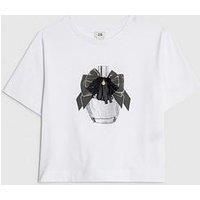 River Island Older Girls Embellished Bow Perfume T-Shirt Size & Fit Available in sizes 5-6 years - 13-14 years Details Older Girls Embellished Bow Perfume T-Shirt by River Island White Cotton fabric Short sleeves Crew neckline Perfume front graphic with hotfix embellished design Material & Care Material Content: Cotton: 100% Washing Instructions: Machine Washable