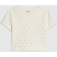 River Island Older Girls Studded Diamante T-Shirt - Cream