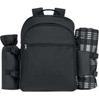 Fabric: Cationic Dyed. Material: Polyester, RPET. Length: 42cm. Width: 32cm. Height: 18cm. Denier: 300D. Pockets: 1 Front Pocket, Zip, 2 Side Pockets, Buckle. Contents: 1 Blanket, 1 Chopping Board, 1 Corkscrew, Cutlery. Compartments: 2 Main Compartments, Coolbag Compartment, Zipped. Suitable for: 4 People. Adjustable Shoulder Strap, Carry Handles. Sustainability: Amfori, BSCI. Design: Plain. | MidOcean Men's Duin Picnic Backpack in Black