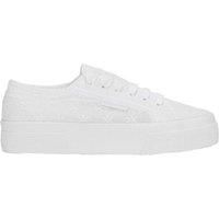 Upper: Cotton Canvas. Lining: Organza. Insole: Synthetic. Midsole: Synthetic. Outsole: Durable, Vulcanised Rubber. 6 Eyelets. Cotton Lace, Engraved Aluminium Eyelets. Platform. Heel Height: 3.5cm. Cut: Low. Design: Flower, Logo, Sangallo. Toe Style: Round. Fastening: Lace Up. | Superga Women's 2740 Sangallo Flower Trainers in White | Size: 5.5