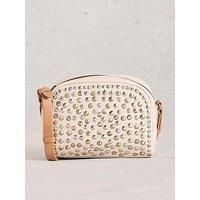 White Stuff Bella Stud Crossbody Bag suede convertible bowling bag, can be used as a handheld bowling bag or as a crossbody with an adjustable strap. hammered hardware studs. Material Content: Outer: 100% Leather, Lining: Cotton