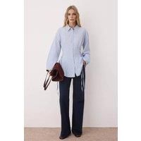 This woven shirt features a classic collared neckline with contemporary side tie detailing that allows for an adjustable, cinched waist fit. Crafted from a lightweight cotton blend, it offers a soft yet structured feel that maintains a polished silhouette throughout the day. The button-up front adds timeless versatility, while the tie accents bring a touch of modern femininity. Perfect for both office wear and casual outings, this shirt combines comfort, refinement, and effortless style for every occasi...