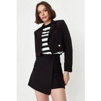 This woven mini skort features a sleek wrap-front design that blends the elegance of a skirt with the comfort of shorts. Crafted from a structured woven fabric, it offers a tailored fit and a clean silhouette ideal for both smart and casual styling. The minimal design allows versatile pairing with blouses, knits, or fitted tops, making it a modern wardrobe essential for everyday wear or polished day-to-night looks. CARE INSTRUCTIONS: Check the care label for instructions. Pre-treat stains before washing...