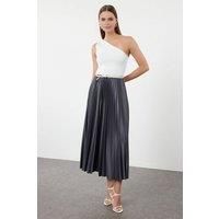 This pleated maxi skirt combines elegance and edge with its flowing silhouette and faux leather finish. Crafted from a stretch-knit fabric, it offers both comfort and structure, allowing effortless movement with every step. The all-over pleated design adds texture and sophistication, making it perfect for both day and night styling. Pair it with fitted tops, blazers, or knitwear for a sleek, polished look that blends modern chic with timeless appeal. CARE INSTRUCTIONS: Check the care label for instructi...