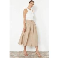 This woven midi skirt is designed with structured pleats and a high-waisted silhouette for a timeless, sophisticated look. Crafted from a smooth woven fabric, it offers both structure and movement. The front button detail and subtle slit enhance its elegant design while ensuring ease of wear. Perfect for both smart and casual occasions, this skirt can be styled with fitted tops or tucked-in blouses for effortless versatility. CARE INSTRUCTIONS: Check the care label for instructions. Pre-treat stains bef...