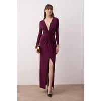 This maxi evening dress radiates modern sophistication with a refined twist-front detail that accentuates the waistline. Crafted from a smooth, stretch fabric, it features a plunging neckline and a thigh-high front slit for a flattering, elongated silhouette. The long sleeves balance its daring cut, offering an elegant finish perfect for formal events, galas, or special celebrations. Combining timeless glamour with contemporary allure, this piece is designed to make a striking impression at any evening ...