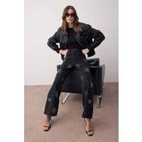 This high-waist stone-detail wide-leg jeans features a high rise silhouette and relaxed wide cut for effortless comfort and chic styling. The scattered stone embellishments elevate the look with subtle sparkle while the stretch denim fabric offers both freedom of movement and lasting wear. Finished with classic five-pocket design and clean hem, these jeans transition seamlessly from daytime errands to evening outings. CARE INSTRUCTIONS: Check the care label for instructions. Pre-treat stains before wash...
