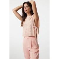 This cropped sweater vest features a classic cable-knit texture with soft, cozy structure and modern side tie detailing. Designed from a comfortable knit blend, it brings warmth while remaining lightweight enough for effortless layering. The cable pattern adds subtle visual depth, and the side openings ensure ease of movement and a relaxed feel. Perfect for pairing over shirts or tops, this versatile vest offers a balance of comfort, style, and timeless layering appeal for everyday wear. CARE INSTRUCTIO...