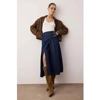 Update your wardrobe with this belted midi denim skirt, designed to deliver a modern take on a timeless classic. Featuring a flattering high-rise waist and a wrap-style front with buckle belt detailing, it offers a structured yet feminine silhouette. The midi length creates a versatile profile that works effortlessly for both daytime and evening styling. Crafted from pure cotton denim, this skirt provides a comfortable, durable feel while maintaining a polished appearance. Style it with fitted tops, shi...