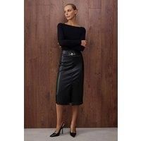 This midi pencil skirt is designed with a sleek faux leather finish and a streamlined silhouette that contours the body for a refined look. Featuring a front split for ease of movement and an integrated belt detail that enhances the waistline, it balances structure with modern elegance. Crafted from a smooth, flexible fabric with a soft inner feel, the skirt offers lasting comfort alongside a polished appearance. Ideal for pairing with fitted tops or statement knits, this versatile piece transitions eff...