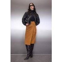 This knit midi skirt features a contemporary wrap design with a refined button detail that enhances its clean and modern silhouette. Crafted from a soft-touch knit fabric with a structured feel, the skirt offers comfortable wear while maintaining a polished shape throughout the day. The wrap construction adds subtle movement and visual interest, while the midi length delivers versatile styling appeal. Perfect for both casual and smart looks, this skirt combines modern design, everyday comfort, and timel...