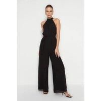This woven maxi jumpsuit features an elegant halterneck silhouette complemented by a self-tie belt that defines the waist for a flattering fit. Designed with a lightweight chiffon outer layer and a smooth lining, it offers graceful movement alongside comfortable coverage. The wide-leg cut creates a fluid, elongated shape, while the sleeveless construction enhances ease of wear. Ideal for special occasions and elevated evening looks, this jumpsuit delivers a refined balance of sophistication, comfort, an...