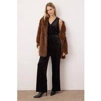 This knit jumpsuit features a flattering V-neckline paired with a soft velvet-textured finish for a refined yet relaxed look. Crafted from a comfortable stretch knit fabric, the design offers a smooth feel with flexible wear throughout the day. The adjustable drawstring waist enhances fit and shape, while the wide-leg silhouette delivers effortless movement and modern appeal. Ideal for both casual styling and elevated everyday looks, this jumpsuit combines comfort, elegance, and versatile wearability fo...