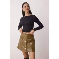 This mini skirt features a sleek structured silhouette with a button-front design that adds a bold and contemporary touch. Crafted from a smooth patent-effect fabric, it offers a polished finish with a subtle sheen and a comfortable fit that holds its shape. The tailored panel detailing enhances the overall structure, while the mini length creates a modern and confident look. Designed for versatility, this skirt transitions effortlessly from evening styling to party-ready outfits. Easy to pair w...