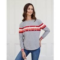 A flattering grey cotton cashmere crew neck with stars cut into a band of stripes in cranberry, orange, cream & red. 3 silver lurex stripes separate the colours that wrap around the jumper. The stripe detailing is repeated on the cuffs. With a scoop hem that skims the hips, you can wear this jumper out of loosely tucked into your waistband. Model height is 5' 8.5" and wears size small.