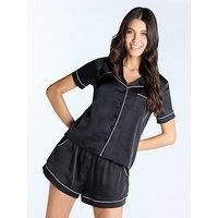 Boux Avenue Luxe Satin Ss Revere & Short Set - Black Slip into elegance with our luxury satin short pyjama set, made from soft liquid satin with beautiful pipe detailing. Short sleeve pyjama shirtMatching pyjama shortsSoft liquid satin materialContrast pipe detailingPocket with Bx embroideryElasticated waist for comfortSide pocketsComplete the look with our fluffy socks or slippers Material Content: 97% Polyester 3% Elastane Washing Instructions: Machine Washable - Manufacturers part number: WDO1S