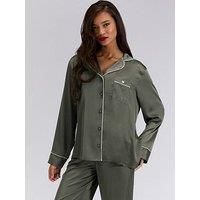 Boux Avenue Oversized Satin Revere & Pant Set - Khaki Size & Fit True to size - order your usual size Relaxed fit Available in sizes 6 - 18 Details Oversized Satin Revere & Pant Set - Khaki by Boux Avenue Green Single Long sleeved shirt Revere collar Straight trouser Elasticated waist detail Button front fastening Logo print Front patch pocket Washing Instructions: Machine Washable