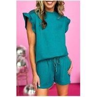 The Skobeloff Textured Ruffle Split Top and Drawstring Shorts is a chic two-piece set designed for comfort and versatility. Featuring a quilted fabric this set includes a sleeveless ruffled shoulder top and matching drawstring shorts. Perfect for casual occasions these pieces can be mixed and matched wardrobe staples such as leggings jeans and tanks. | Everyday The Label Women's Skobeloff Textured Ruffle Split Top & Drawstring Shorts in Teal | Size: XL