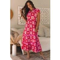 Feel vibrant and confident in the Strawberry Pink Geo Print V-neck Maxi Dress. This long dress is crafted from soft fabric featuring a beautiful geometric print that makes it unique and head-turning. The short sleeve design is perfect for warm weather offering both style and comfort. This maxi dress is flattering and stylish ideal for any occasion. | Everyday The Label Women's Strawberry Pink Geo Print V-neck Maxi Dress | Size: Small