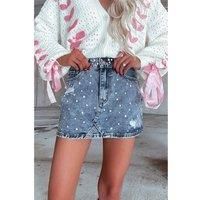 Elevate your look with this trendy mini skirt. Crafted from a comfortable cotton blend denim it is adorned with sparkling rhinestones and has a stylish distressed design. Perfect for casual days or nights out. Denim mini skirt with rhinestone embellishments . Distressed design for a stylish look . Slim fit mini length . Comfortable cotton blend denim . Perfect for casual or night out wear.