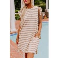 This casual mini dress is made from a soft cotton blend and features a relaxed fit side pockets and a classic striped pattern. Perfect for summer outings. Casual striped mini dress . Soft and comfortable cotton blend fabric . Relaxed fit . Side pockets . Perfect for summer.