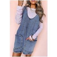 Stay cool and stylish with the dusk blue sleeveless denim romper. This romper features a flattering U neck design adding a touch of elegance to your look. Made from durable denim material it offers a timeless appeal and practicality with front patched pockets to keep your essentials close at hand. | Everyday The Label Women's Dusk Blue Sleeveless U Neck Patched Pocket Denim Romper in Mid Blue | Size: Medium