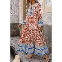 The Orange Boho Geometric Printed Long Sleeve Maxi Dress is a vibrant and culturally inspired piece that brings a colorful vibe to your wardrobe. Featuring boho-inspired geometric prints this dress is designed with long sleeves and a split neck for an elegant touch. The maxi length offers a flattering flared silhouette perfect for pairing with sandals or heels for a chic summer look. | Everyday The Label Women's Orange Boho Geometric Printed Long Sleeve Maxi Dress | Size: Medium