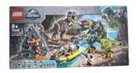 Danger! Danny Nedermeyer is roaming Jurassic World park in his huge Dino-Mech on a mission to steal the treasure hidden in the Isla Nublar volcano. But first he has to face the mighty T. rex. Jump in the boat with Owen Grady, Claire Dearing, Vic Hoskins—plus baby velociraptors Blue, Delta, Echo and Charlie—and speed to the battle scene. Fire the boat's stud shooters at the Dino-Mech. Put the T. rex to sleep with the tranquiliser gun. You must stop Danny before he finds a way to smash into the volcanic rock and steal the treasure! Features: This LEGO® Jurassic World dinosaur toy playset includes 4 new-for-June-2019 minifigures: Owen Grady, Claire Dearing, Vic Hoskins and Danny Nedermeyer, plus 4 baby velociraptor toy figures—Blue,...