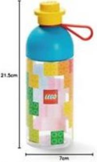 This transparent drinking bottle has a simple design that features a LEGO knob as lid and a removable silicone strap that makes the bottle easy to carry.The non-transparent top can be screwed off making the bottle easy to fill with water and ice cubes or what else is needed to stay hydrated and keep cool all day. The flask is very easy to clean and dishwasher safe.Dimensions: . Height - 70mm.. Width - 70mm.. Depth - 215mm.. Weight - 0.115kg. - Manufacturers part number: 40420800