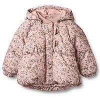 Wheat Baby Girls Floral Padded Olga Jacket - Pink A winter essential padded jacket with print and fleece lining for babies. Wheats padded jacket is perfect for cold autumn and winter days. Please note that the padded styles are not entirely waterproof as they do not have taped seams. --- Water resistant: 8.000 mm Breathability: 5.000 g/m2/24 h Abrasion resistance: 30.000 rub Flourine-free water and soil repellent finish Material Content: 100% recycled polyester Washing Instructions: Machine Washable Det...