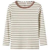 Name It Mini Girls Striped Long Sleeve Tshirt - Brown Put together the perfect outfit for your child with quality everyday styles and create a comfortable and trendy look. Material Content: 57% Cotton - Organic, 23% Polyester - Recycled, 16% Metallic Fibres, 4% Elastane Washing Instructions: Machine Washable Slim fit Lace detail Glitter detail