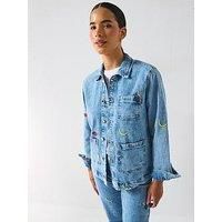 PIECES Jidi Long Sleeve Denim Embroidered Shacket Size & Fit True to size - order your usual size Regular fit Available in sizes XS - XL (XS:UK 6, S:UK 8, M:UK 10, L:UK 12, XL:UK 14) Model is 5'9" and wears a UK size 8 Details Jidi Long Sleeve Denim Embroidered Shacket by PIECES Blue Collared Button through fastening Three patch pockets Embroidered detail Long sleeves Material & Care Material Content: 99% Cotton, 1% Elastane Washing Instructions: Machine Washable