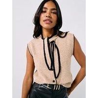 Vero Moda Vmnapoli Knitted Sleeveless Cardigan Size & Fit True to size - order your usual size Regular fit Available in sizes XS - XXL (XS:UK 6, S:UK 8, M:UK 10, L:UK 12, XL:UK 14, XXL:UK 16) Details Vmnapoli Knitted Sleeveless Cardigan by Vero Moda Cream Knit fabric Tie neckline Sleeveless design Button front fastening Contrast trim detail Rib-knit armholes and hem Material & Care Material Content: 75% Polyester - Recycled, 8% Acrylic, 8% Nylon, 7% Wool - RWS, 2% Elastane