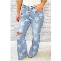 Stand out in the Sky Blue Star Printed Multi Buttons Slit Knee Destroyed Plus Size Jeans. These jeans feature a trendy star-printed design and a unique multi-button detail. The slit knee and destroyed elements add a bold statement making these jeans perfect for pairing with various tops and shoes. | Everyday The Label Women's Sky Blue Star Printed Multi Buttons Slit Knee Destroyed Plus Size in Pale Blue | Size: 18