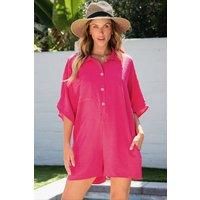 Bright pink half button collared loose romper. Casual romper in solid color. Button closures turn. down collar and short sleeves. Oversized silhouette suitable for different body shapes. Perfect to pair with any shoes or sandals for a daily fashion look. Cheap rompers dropshipping of all ages. Refer to size chart for measurements. Material: . Size on Tag: XL.
