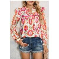 This blouse features a vibrant floral print a charming ruffle neck and elegant long sleeves. It's a stylish and eye-catching piece for any occasion. | Everyday The Label Women's Rose Floral Printed Ruffled Long Sleeve Blouse | Size: Large
