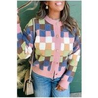 Elevate your style with this cardigan featuring a unique checkered pattern and button closure. Its soft knit material ensures warmth and comfort. | Everyday The Label Women's Multicolour Plush Checkered Pattern Button Front Cardigan Sweater | Size: Medium