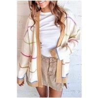 This open-front knit cardigan offers a comfortable and stylish layering piece. It features long sleeves and front pockets making it a versatile addition to any wardrobe. | Everyday The Label Women's White Color Block Striped Open Front Cardigan With Pocket | Size: Medium