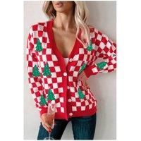 This charming cardigan features a classic checkered pattern adorned with delightful tree accents perfect for adding a touch of playful style to any outfit. | Everyday The Label Women's Red Checkered Christmas Tree Pattern Button V Neck Cardigan Sweater | Size: Small