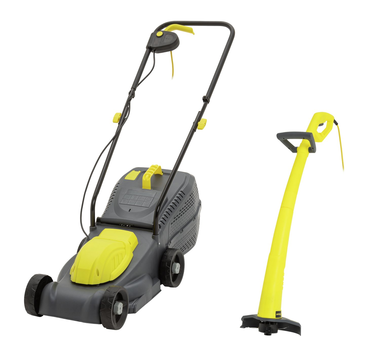 This Challenge twin-pack will make sure the grass is greener on your side. The corded 1000W rotary lawnmower has 3 cutting speeds and a 30 litre collection box, making it perfect for small to medium lawns. Take care of any tough spots with the 250W grass trimmer and youll soon have that manicured look. Model number: CER1032A/CET2525A. Lawnmower features:250 watt electric rotary motor. Metal blade. 32cm blade width. Cutting heights ranging from 2cm - 6cm. 30 litre grass collection box. 6m power cable. Sa...