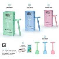 Description. Specifications. Care Guide. Story Behind The Product. Our reusable eco safety razors for women or men are precision engineered to provide a smooth and comfortable zero waste shaving experience. Each men's or women's safety razor has a textured grip and extra long chrome metal handle, perfectly balanced for shaving hard to reach areas.. Our DE eco friendly safety razors are accompanied by a natural white travel bag, made from a blend of soft organic cotton and ethically sourced jute. We ho...