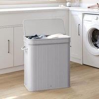 Organize your weekly laundry with this generous 100L bamboo basket featuring sturdy 17mm bamboo construction and convenient one-hand lid operation. The metal frame reinforcement supports up to 25kg while the foldable design saves space when not needed. The removable machine-washable cotton liner and rope handles make laundry transport effortless. Made from bamboo, cotton and polyester fabric, and metal frame. | SONGMICS Large Bamboo Laundry Hamper Machine Washable Removable Basket Handles in Light Grey