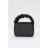 This cute little box-style handbag embellished with dazzling diamantes is perfect for making a statement at elegant dinners or evening events. Handcrafted from premium satin. One main compartment, fully lined with a zip closure. Carry by the ruffled top handle, or wear across the body using the satin strap. | Belissh Women's Satin All Over Diamante Camera Bag in Black - Manufacturers part number: Belissh_7331898671939