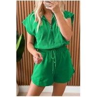 Elevate your summer style with this Bright Green Textured Short Sleeve Half Zip Drawstring Waist Romper. Crafted from a textured fabric that adds depth and dimension this romper features a half zip front closure for a modern and sporty touch. The drawstring waist detail allows you to define your silhouette while enhancing comfort. With short sleeves this romper offers a laid-back and relaxed vibe perfect for casual outings. | Everyday The Label Women's Bright Green Textured Short Sleeve Half Zip Drawst...